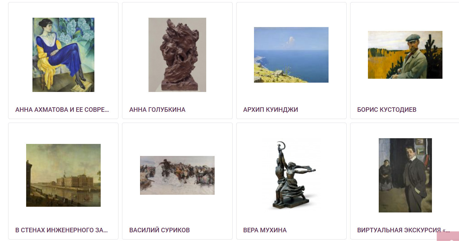 У Русского музея есть портал «Виртуальный Русский музей», на котором представлены лекции и изображения экспонатов, а также можно посмотреть некоторые мероприятия в музее онлайн. Материал подойдет для ребят постарше.