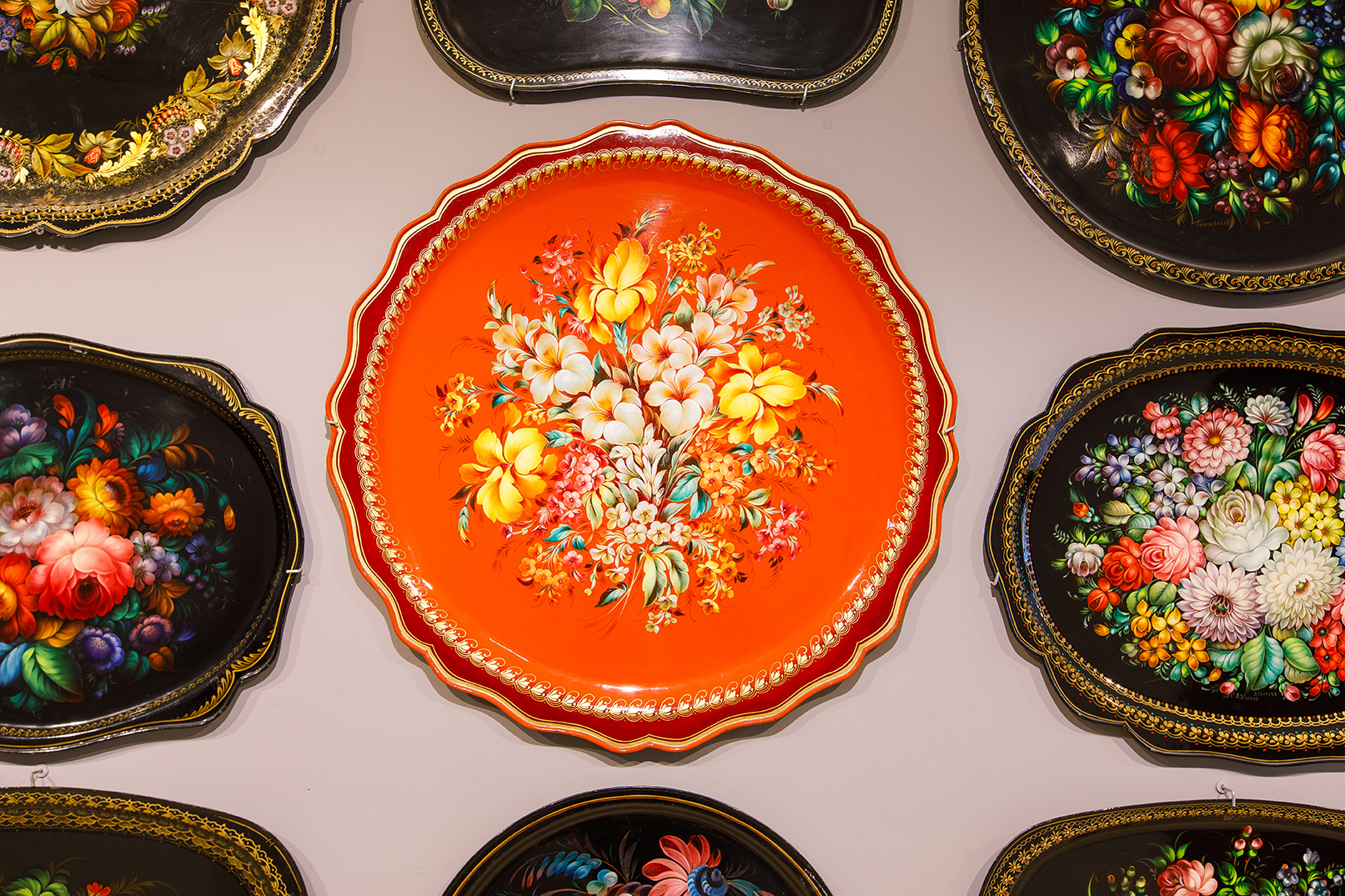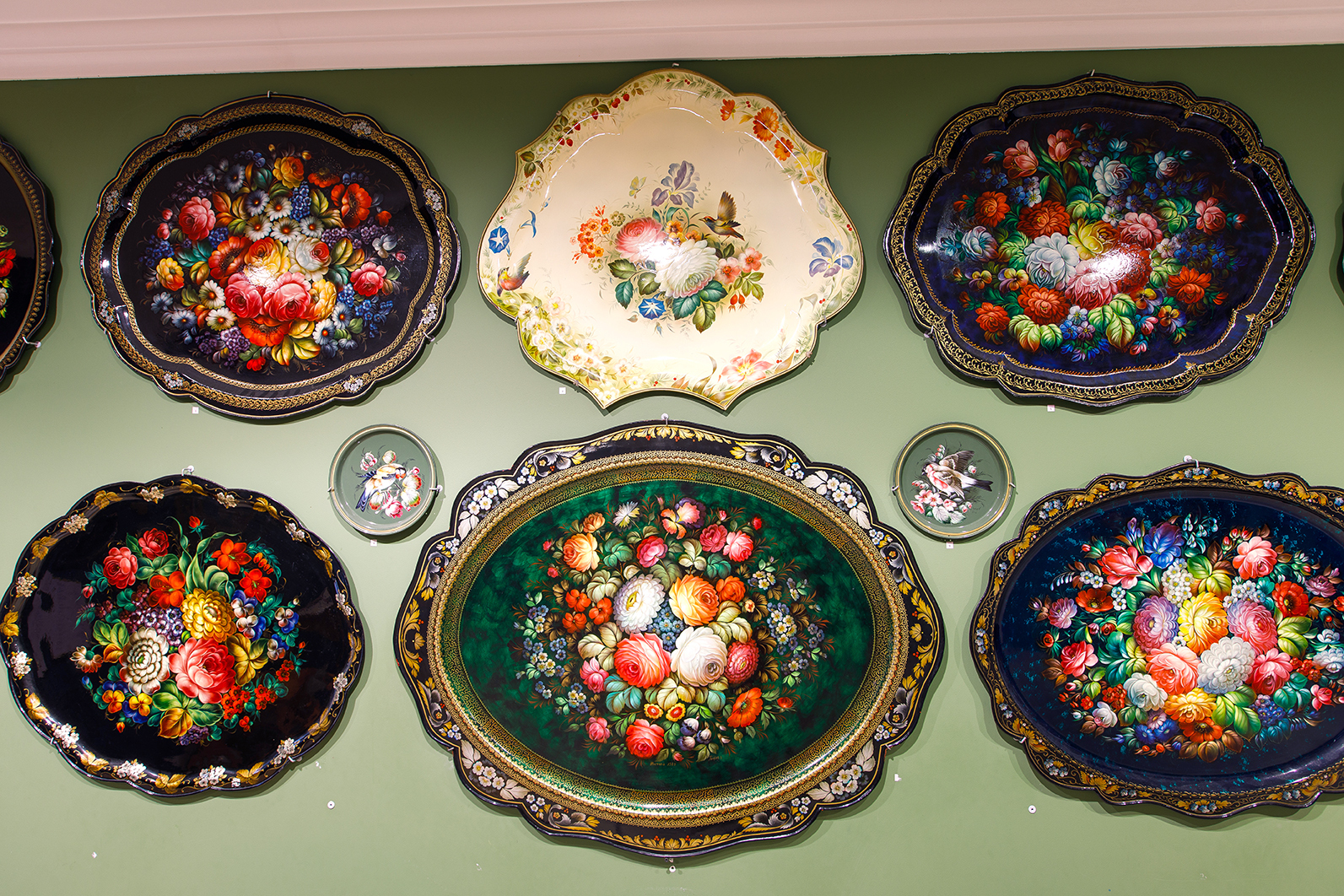 В Жостово пишут чудесные цветы с 1825 года. Жостовский букет – один из самых ярких символов современного народного искусства. Каждое изделие уникально, расписано вручную и демонстрирует индивидуальный стиль автора. В собрании представлены работы мастеров с мировыми именами.