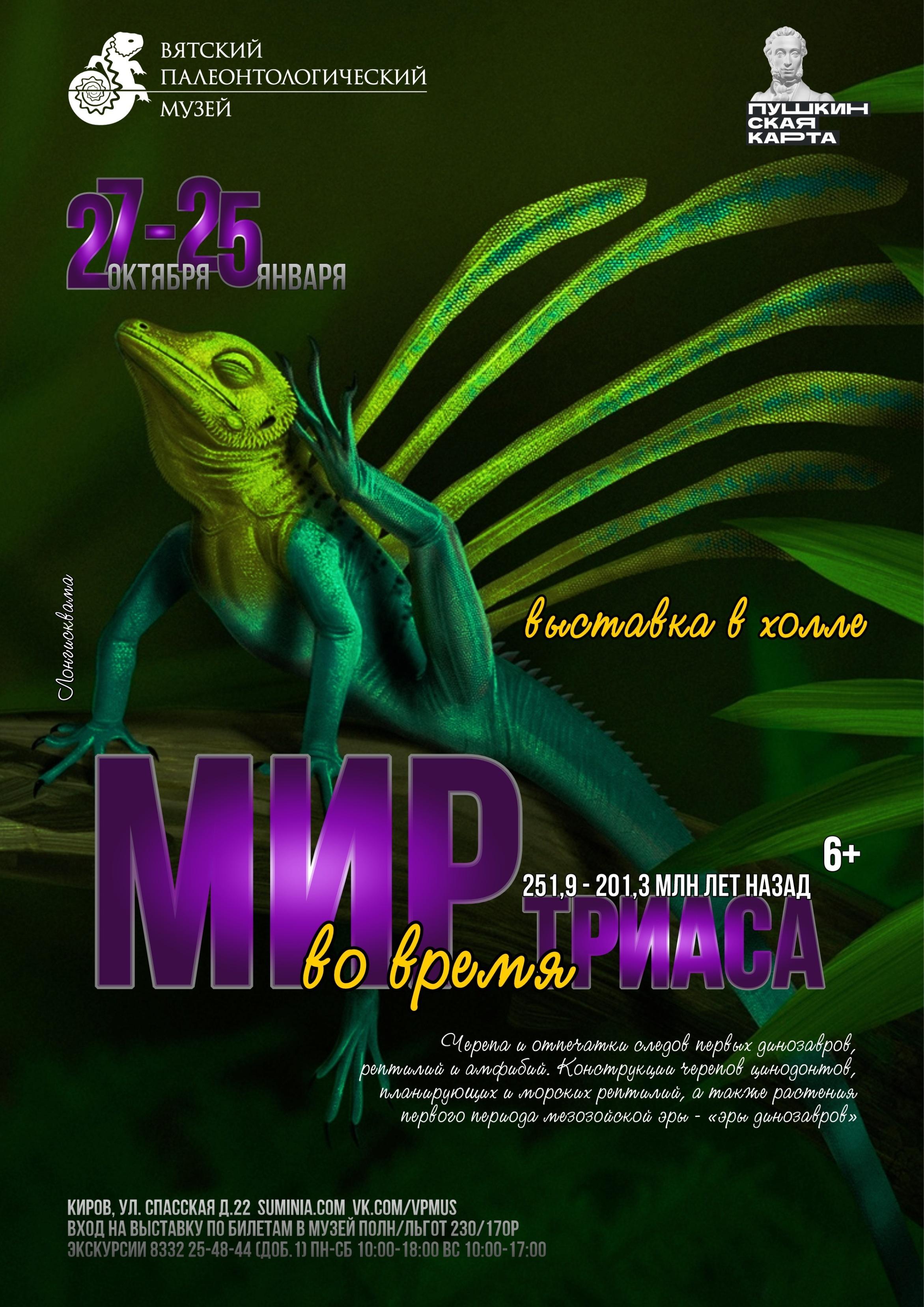 Триас – первый период мезозойской эры, известный как «эра динозавров». Время, когда экосистемы восстанавливались после крупнейшего массового вымирания и полностью перестраивались. В конце триаса появились первые динозавры и млекопитающие. Загадочный и такой безумно далекий мир.Вы сможете представить, как около 250 миллионов лет назад, по земле бродили первые динозавры, в небе парили причудливые планирующие рептилии, а по суше уже бегали первые млекопитающие.На выставке вы увидите черепа и отпечатки следов первых динозавров; рептилий и амфибий, обитавших на территории Восточной Европы, в том числе Кировской области; конструкции черепов цинодонтов – группы, предковой для млекопитающих; планирующих и морских рептилий, а также растения.Выставка открыта с 27 октября до 25 января 2026. Вход по входным билетам в музей. Заявки на экскурсии для групп и индивидуально по тел. 8332 2548-44 (доб.1)